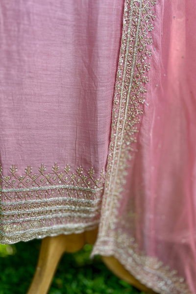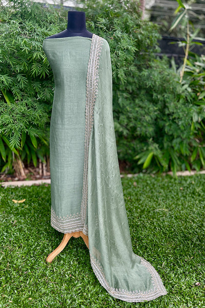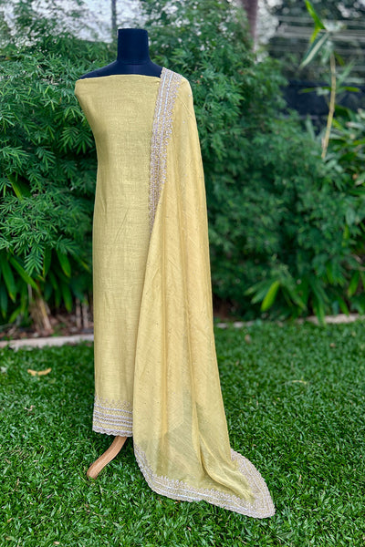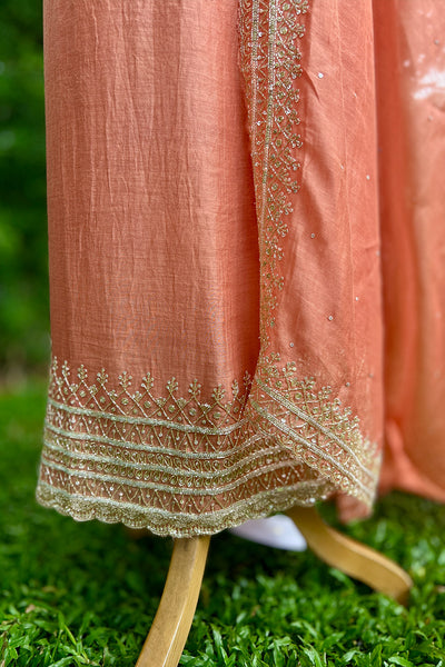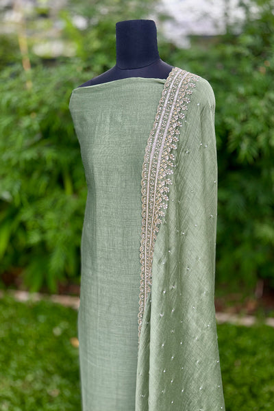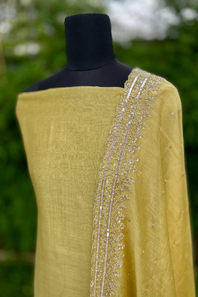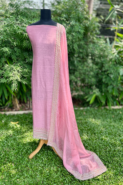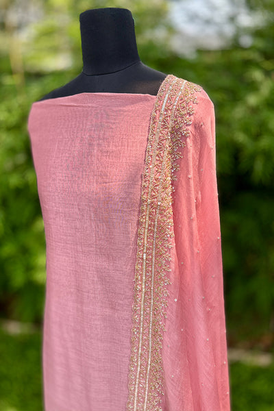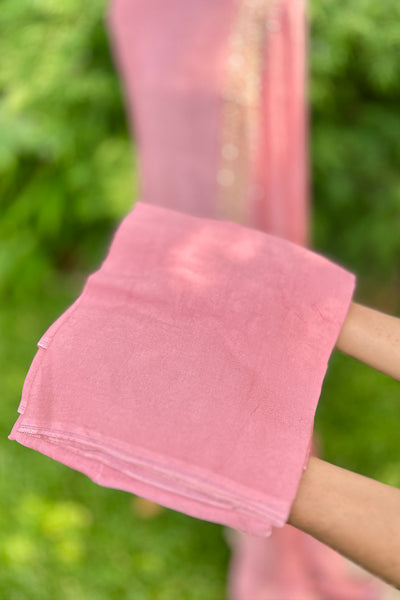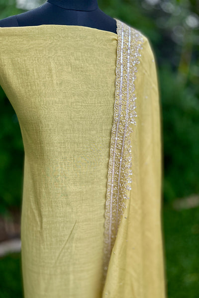 Chandari Salwar material is a luxurious fabric that comes in a variety of beautiful shades, offering elegance and versatility. The top area features intricate handwork edges, adding a delicate touch of craftsmanship, while the Dupatta is adorned with a fully handworked border and scattered sequins that create a shimmering effect. The set also includes a matching Shantoon pant portion, completing the ensemble with a comfortable yet stylish finish. This outfit is perfect for those looking to add sophistication and tradition to their wardrobe.