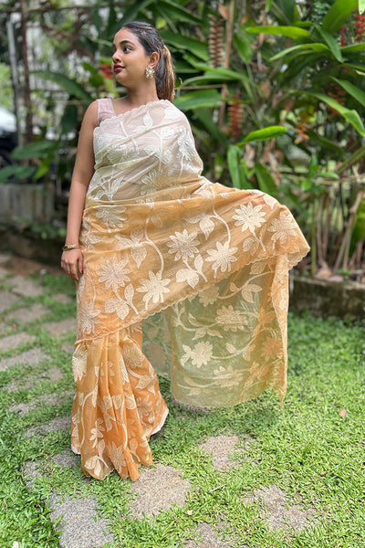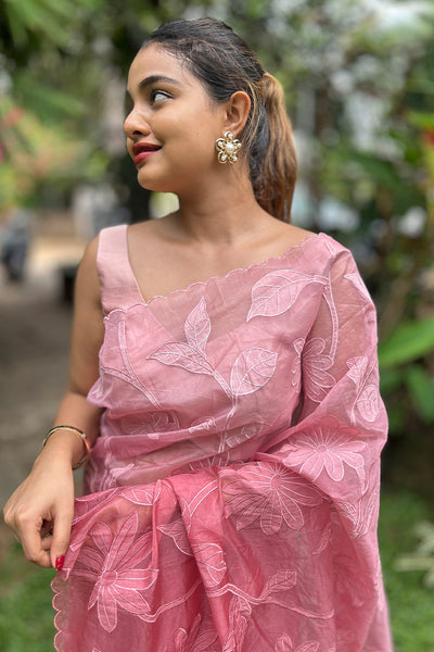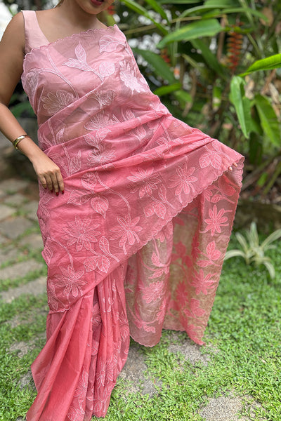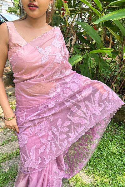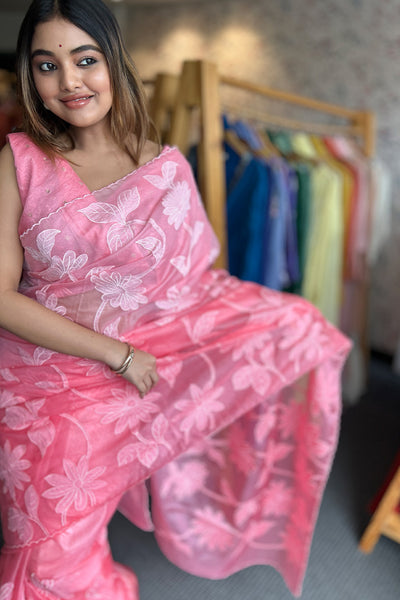 The organza saree comes as dual shade ombré effect with floral appliqué. It pairs with chanderi blouse material.