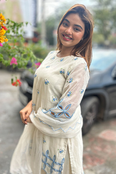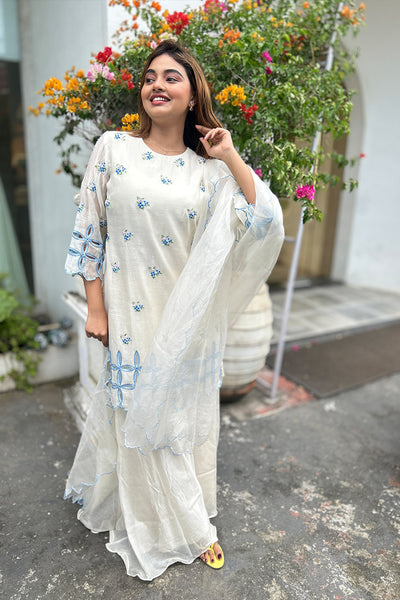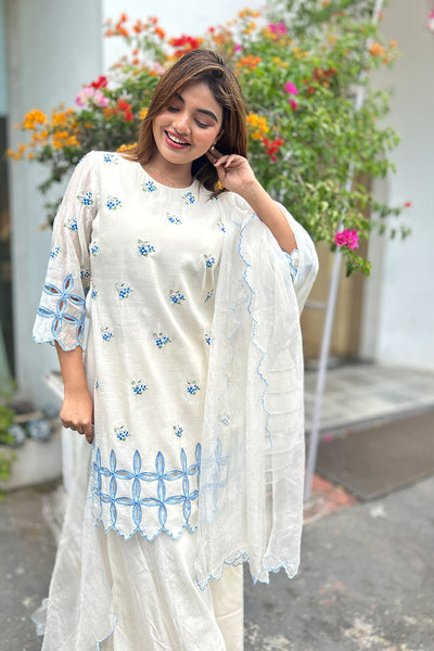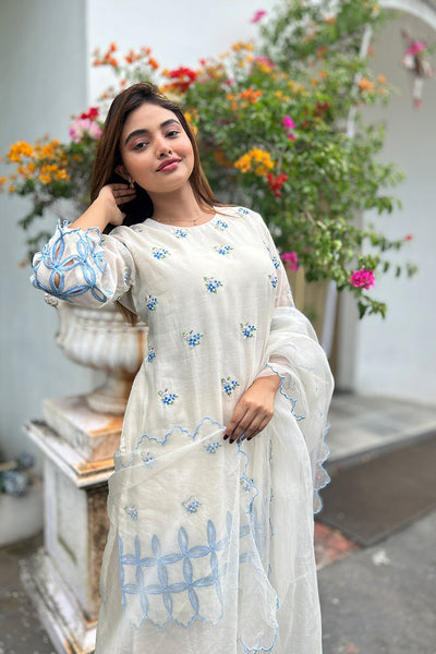 Introducing “ Tamaya “our latest collection crafted from pure Malai Chandari fabric. This elegant salwar suit set features a stunning white and blue combination, with intricate embroidery in a delicate blue work pattern. The design is beautifully highlighted with eye-catching materials, making it the perfect blend of tradition and contemporary charm. Ideal for any special occasion…