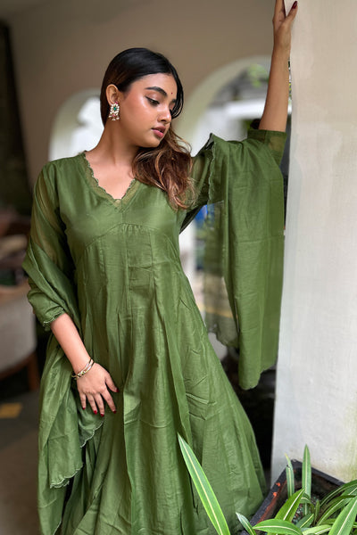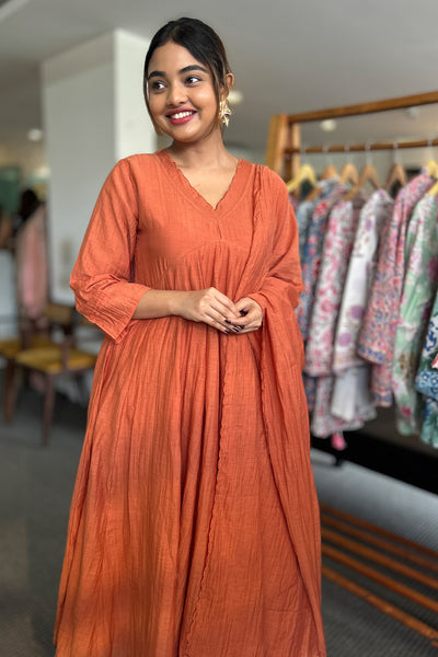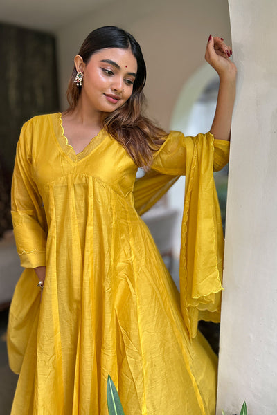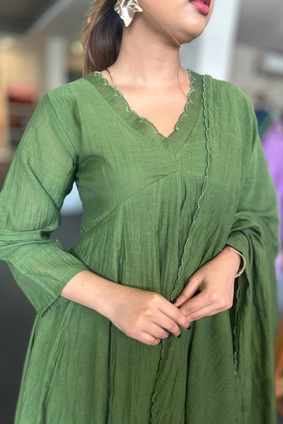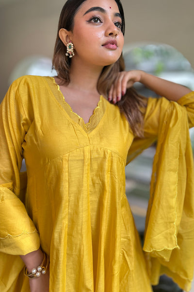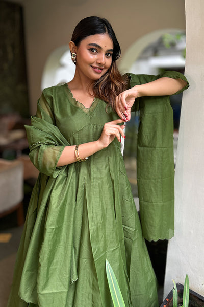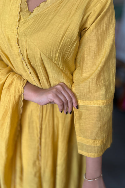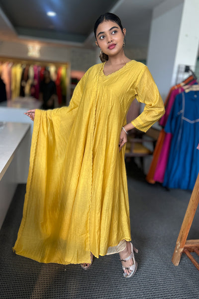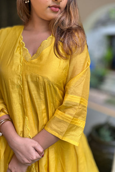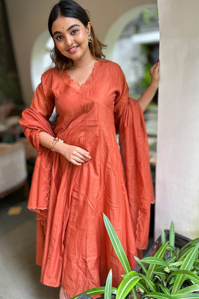 The malai Chanderi Salwar suit comes with solid colour top and Dupatta and pairs with striped pants. Neck and Dupatta edges finished with scallops and the top pattern comes as panel cut.