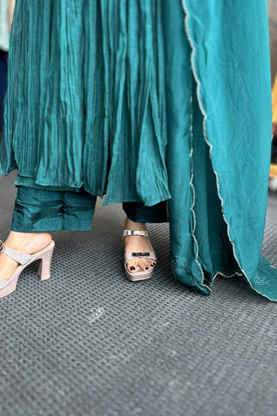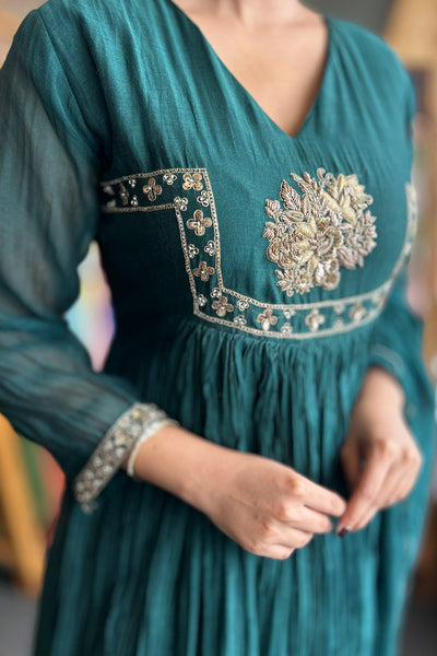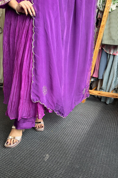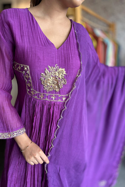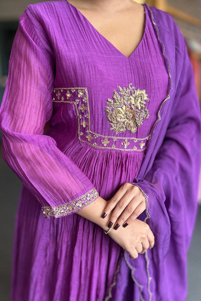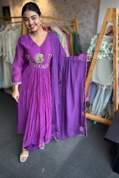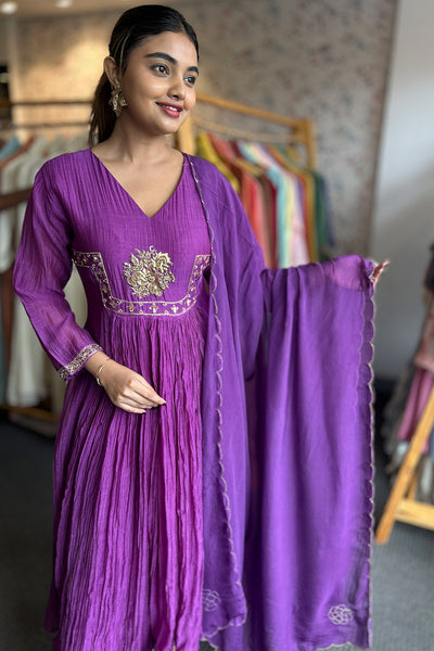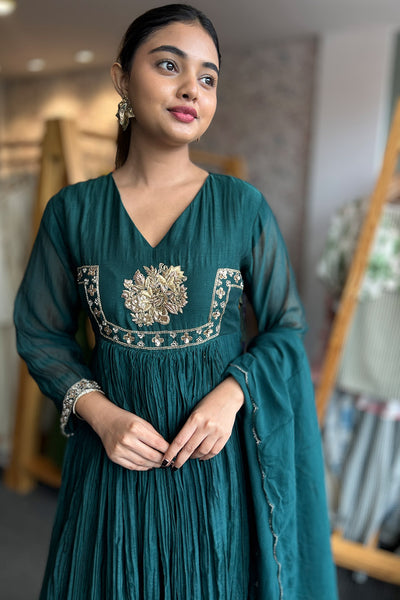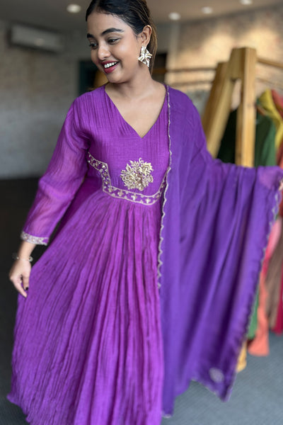 The fully stitched salwar suit festive wear collection comes with Malai chanderi top with georgette organza Dupatta and Shanoon pant. It comes with yok potion, handwork, and gathers pattern.