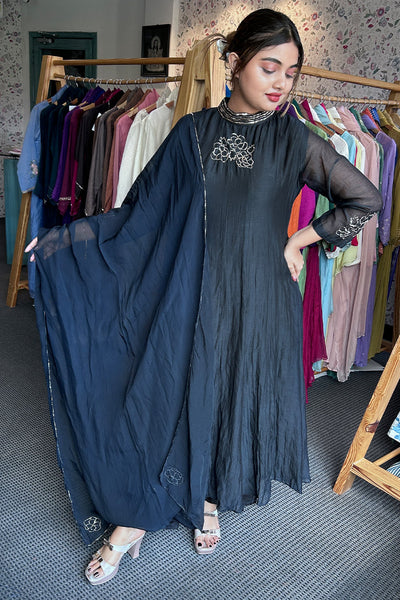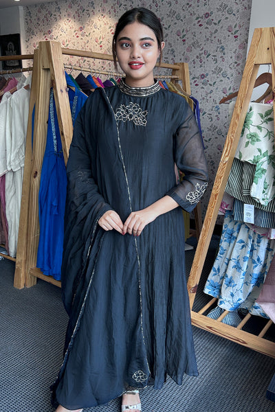 The fully stitched salwar suit comes in Malai chanderi with panel cut and pita work highlighting it. It comes with a closed neck and pairs with beautiful Dupatta and straight pant.