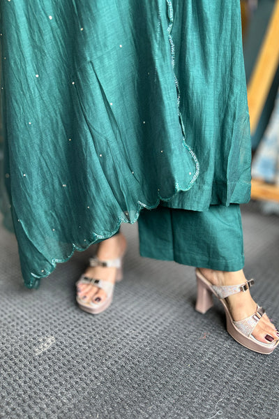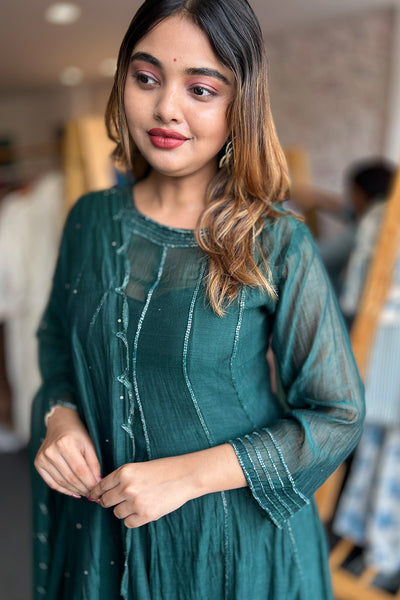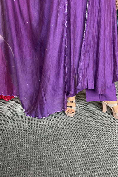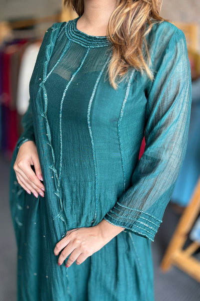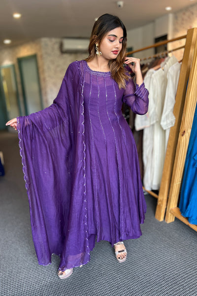 The fully stitched salwar suit comes in Malai chanderi with panel cut and cut bead line highlighting it. It comes with a closed neck and slip inside with the top and pairs with beautiful Dupatta and straight pant.