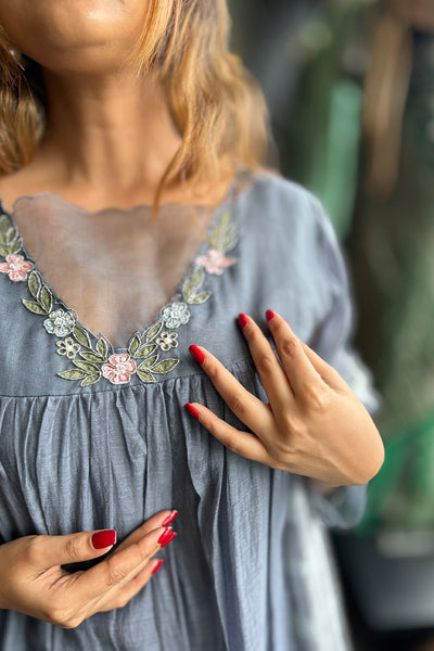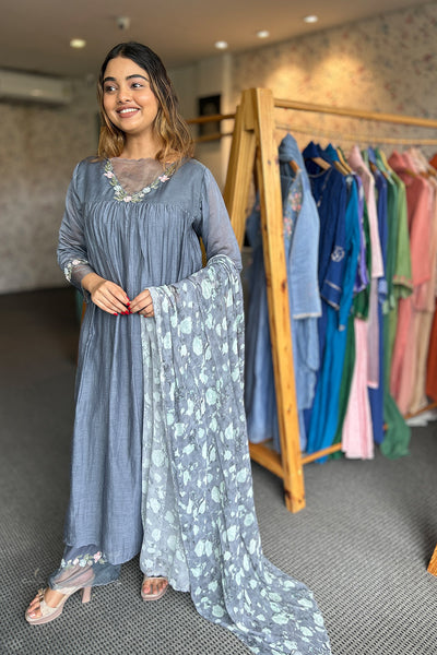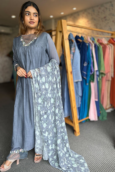The grey colour fully stitched salwar suit comes in Chanderi fabric as top Georgette printed Dupatta pairs with straight pants with organza with scallop edges and app embroidery on yolk sleeve and bottom.