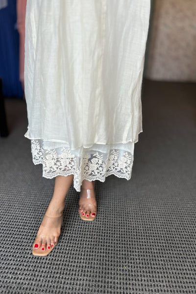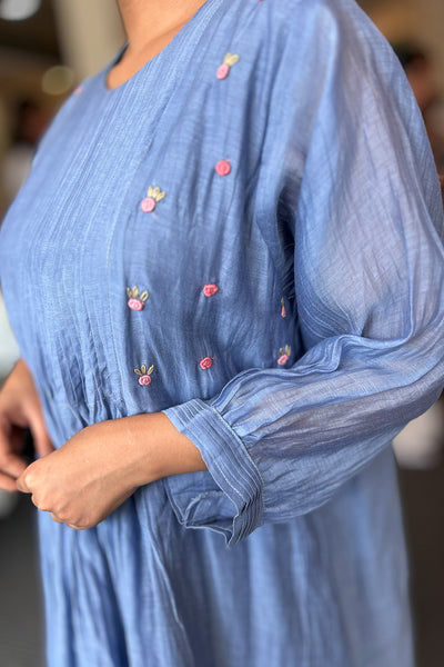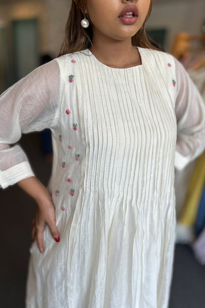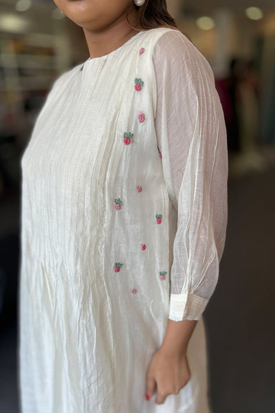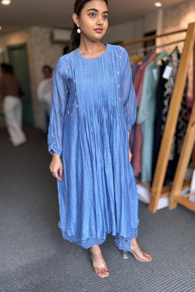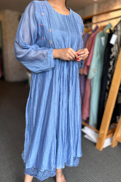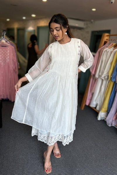 Malai Chandari Dress comes in round neck pattern with handwork on sides of Yok and Lace - detailing on end of the top.