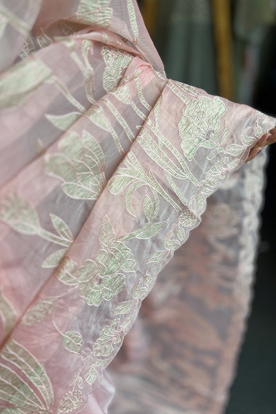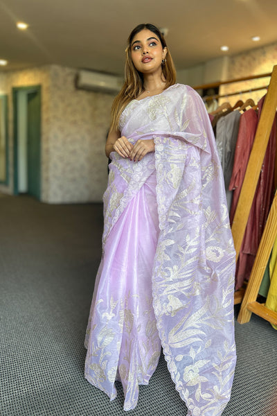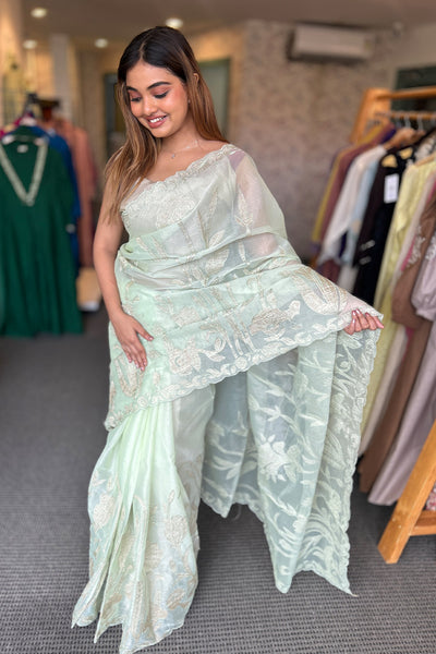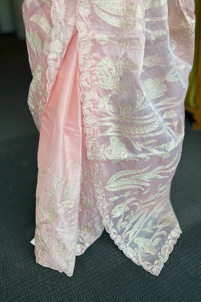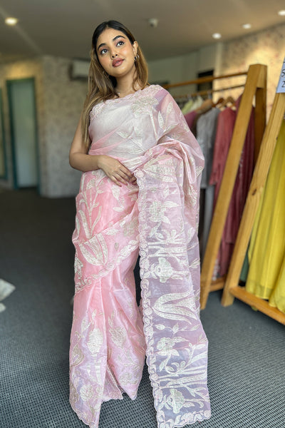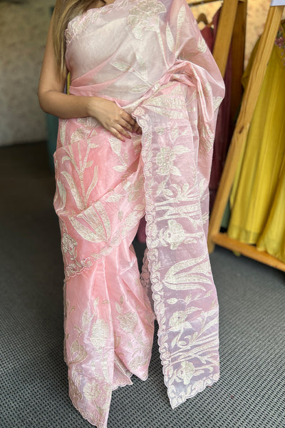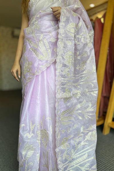 Organza saree with appliqué Work on both side of the body part ,borders and scallop edges. The blouse material comes in crushed tissue. The same crushed tissue appliqué you can see on the Saree.