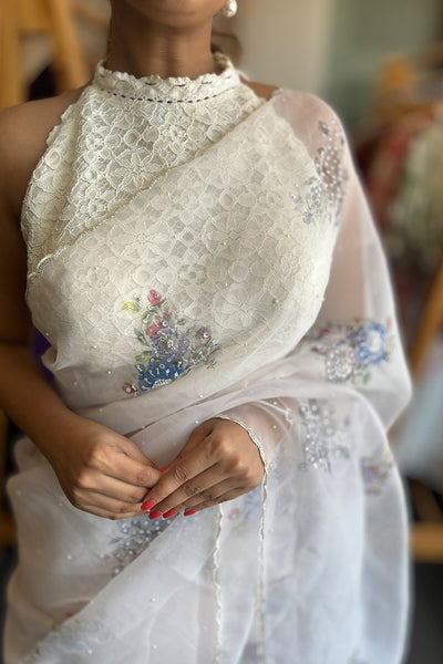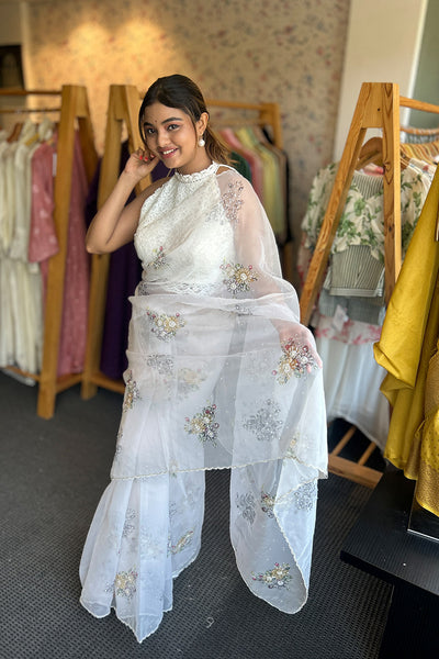 White organ Saree with Floral digital print on it. It highlighted with the sequence and cut beads pairs with the matching floral printed blouse piece, and it comes with scallop edges.