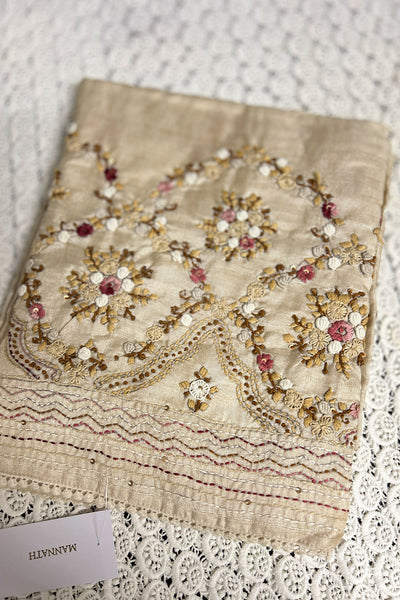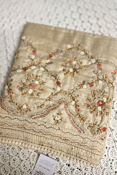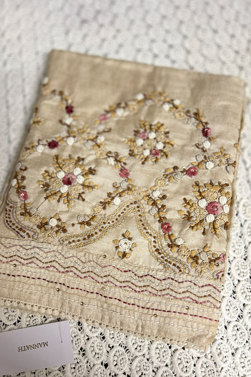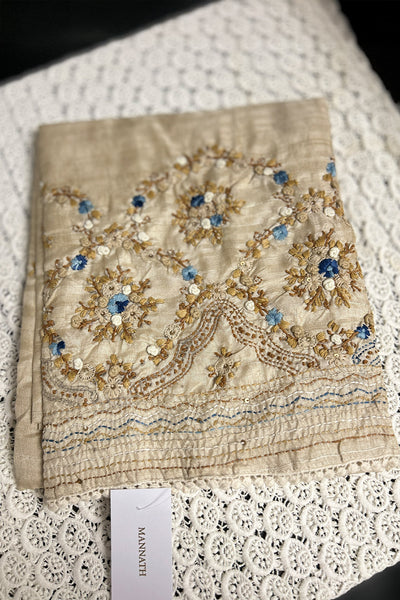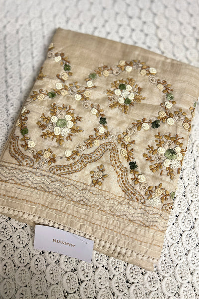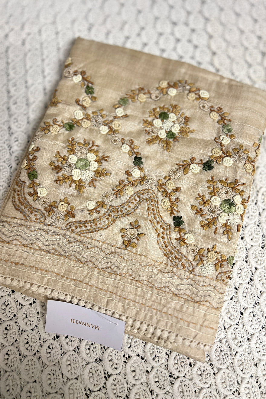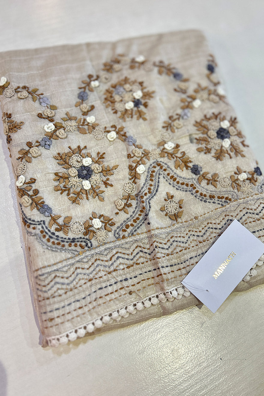 The semi Tussar Saree in beige shade comes with bullionknot floral thread embroidery with sequence highlighting also comes with the Kantha stitches on Pallu part, butta designs all over the saree pairs with matching blouse.