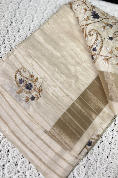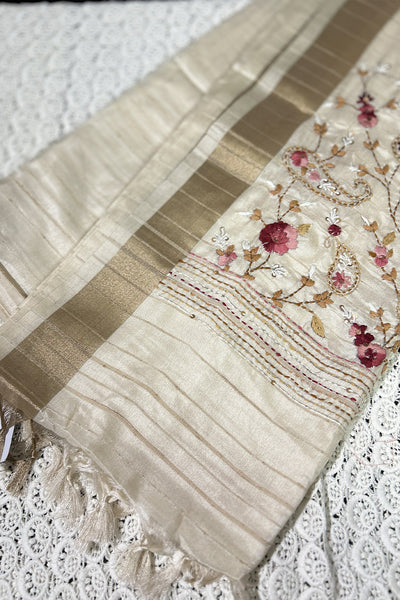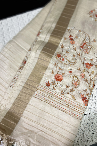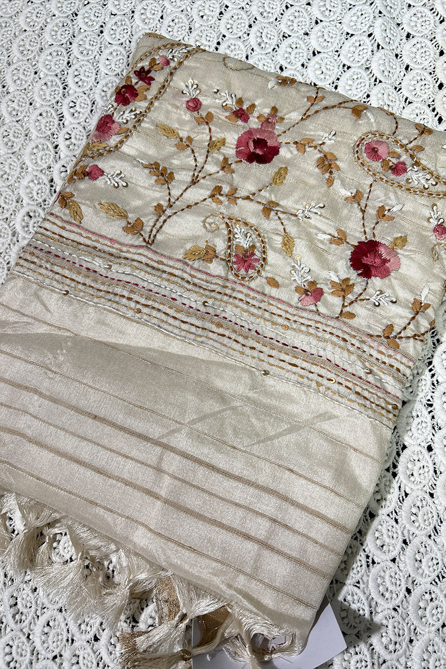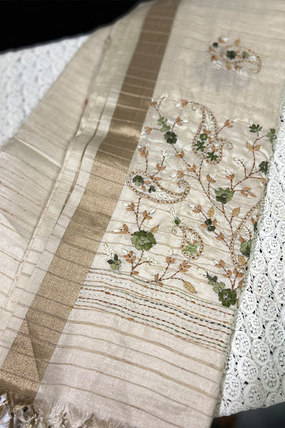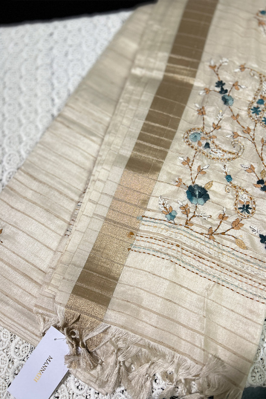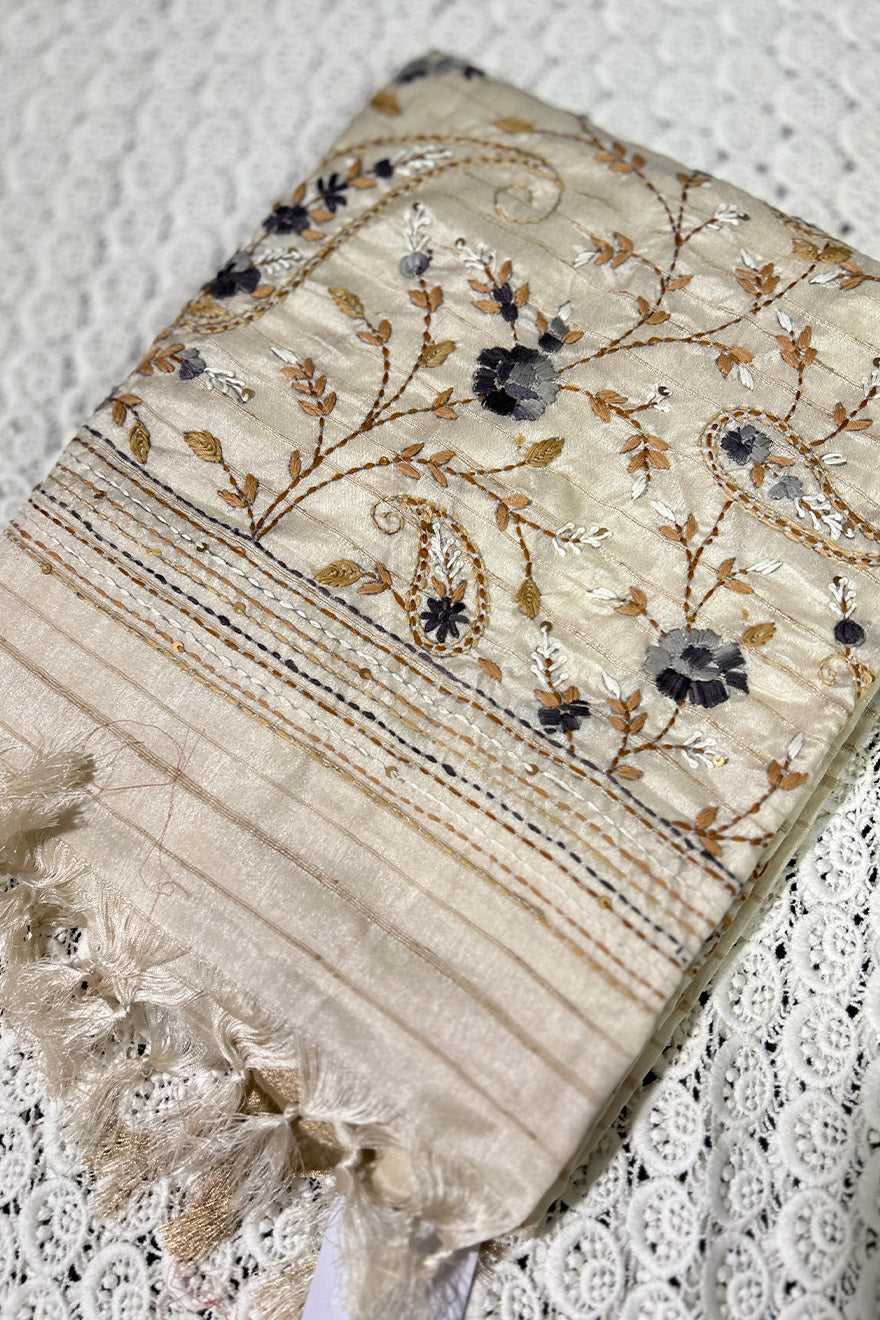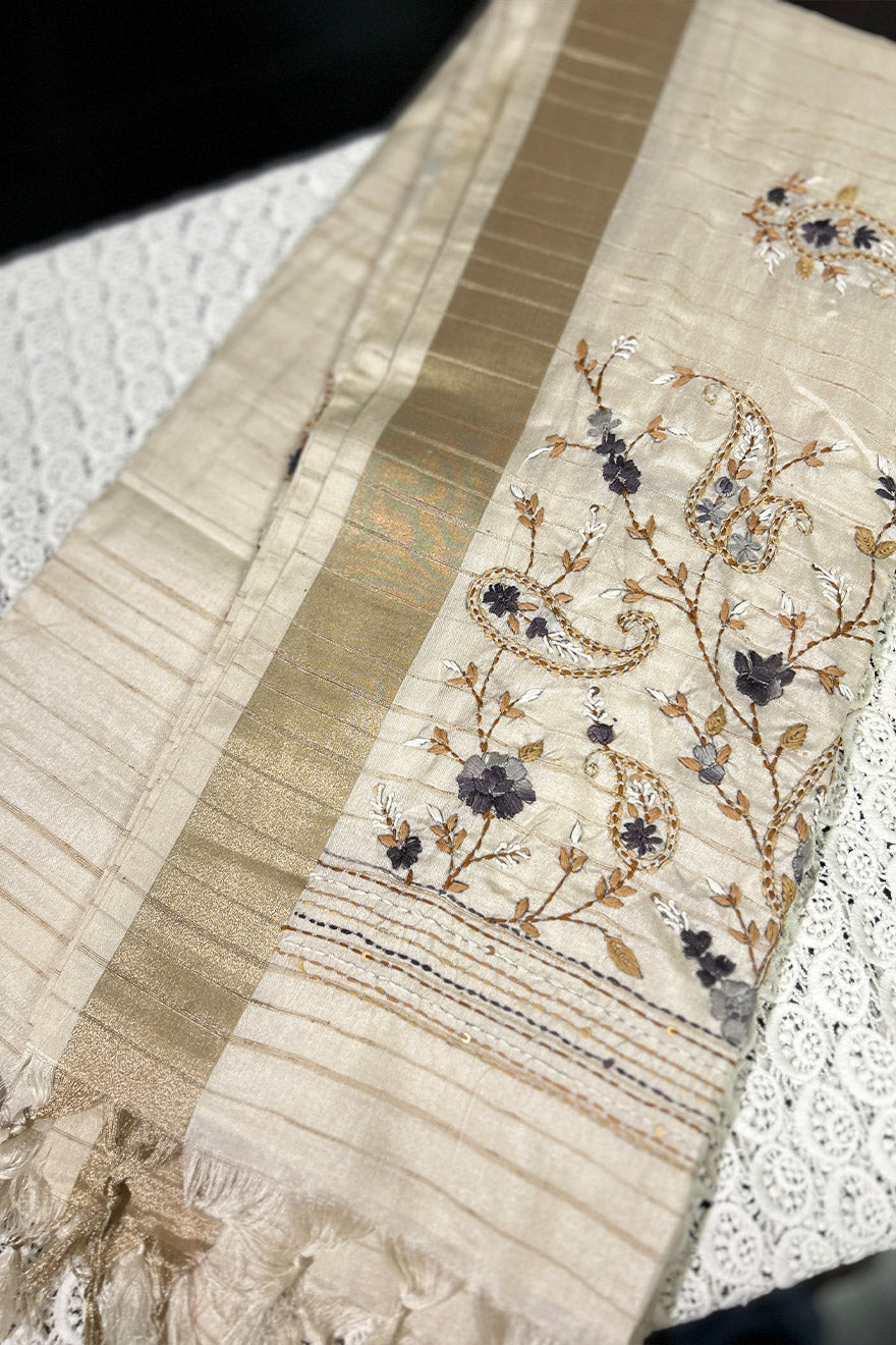 The semi Tussar Saree in beige shade comes with bullionknot  floral thread embroidery with sequence highlighting also comes with the Kantha stitches on Pallu part, butta designs all over the saree pairs with matching blouse.