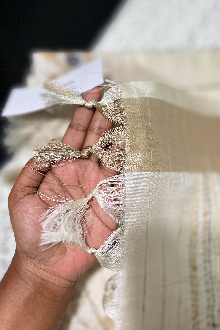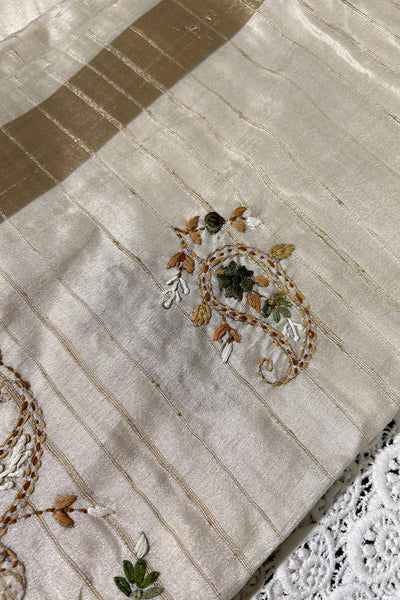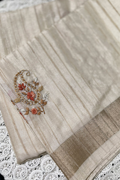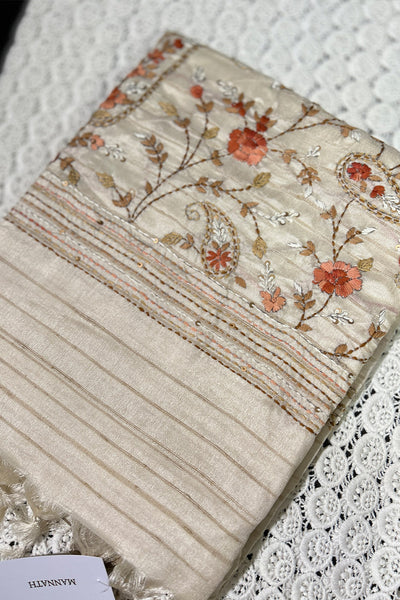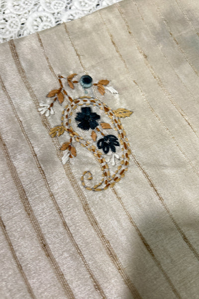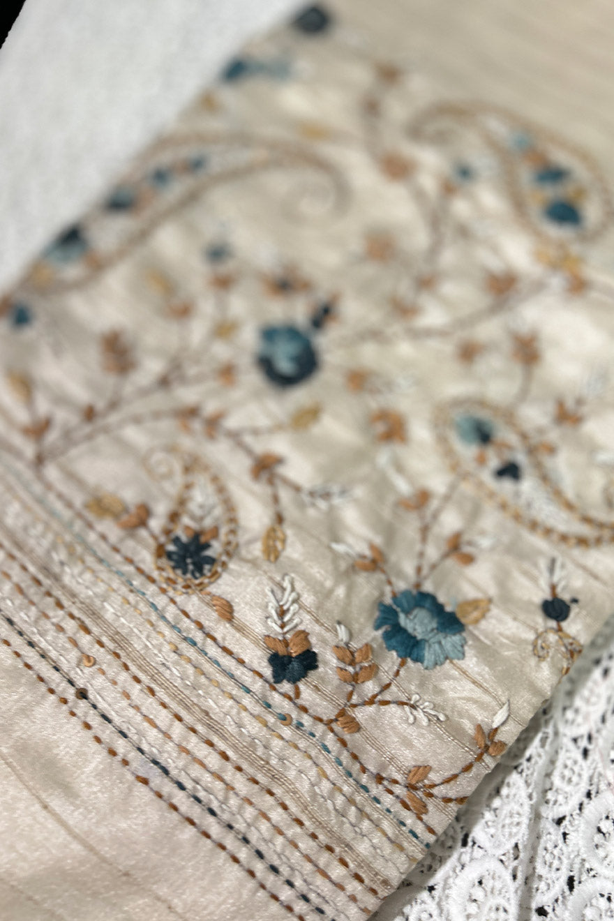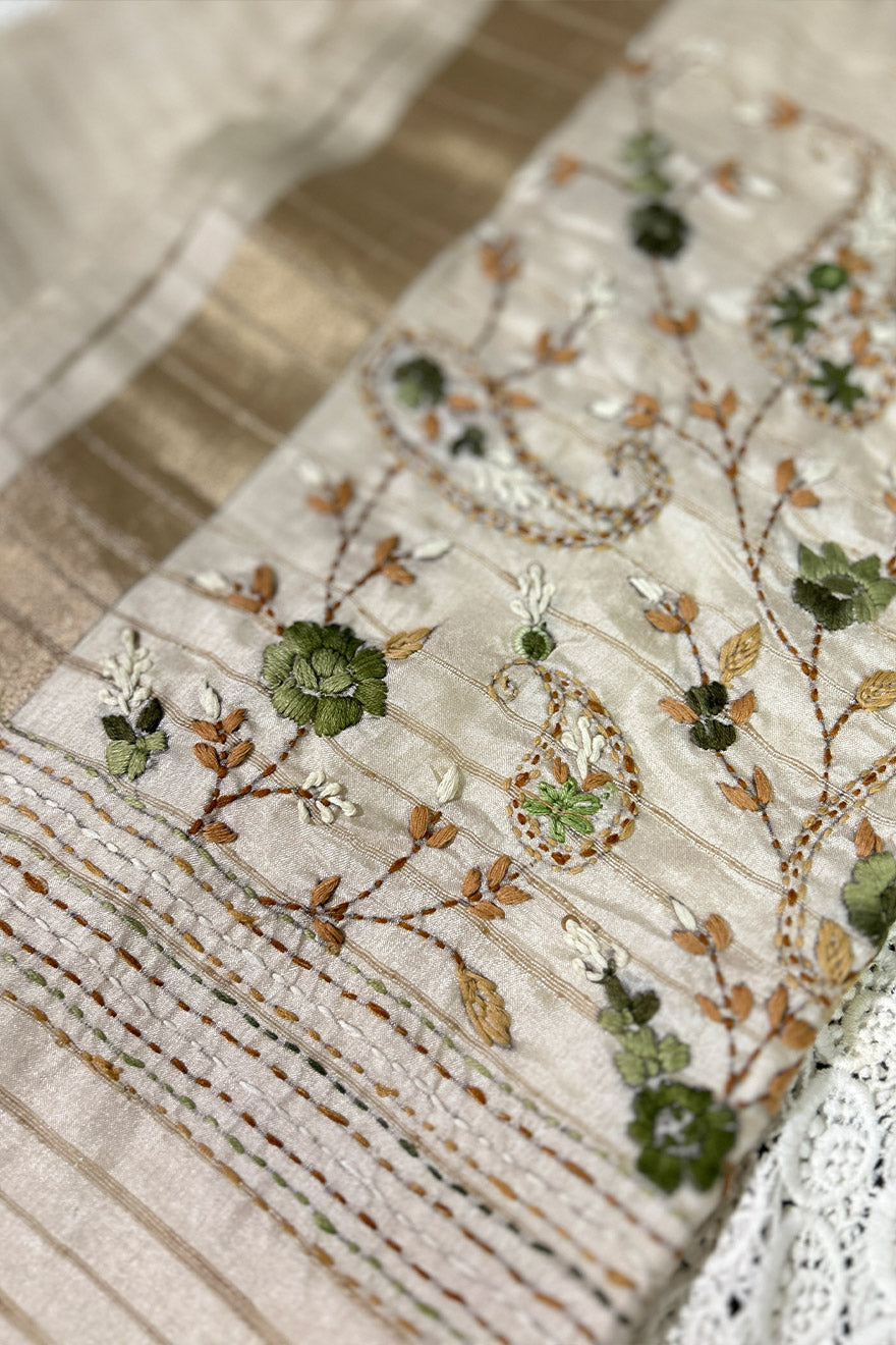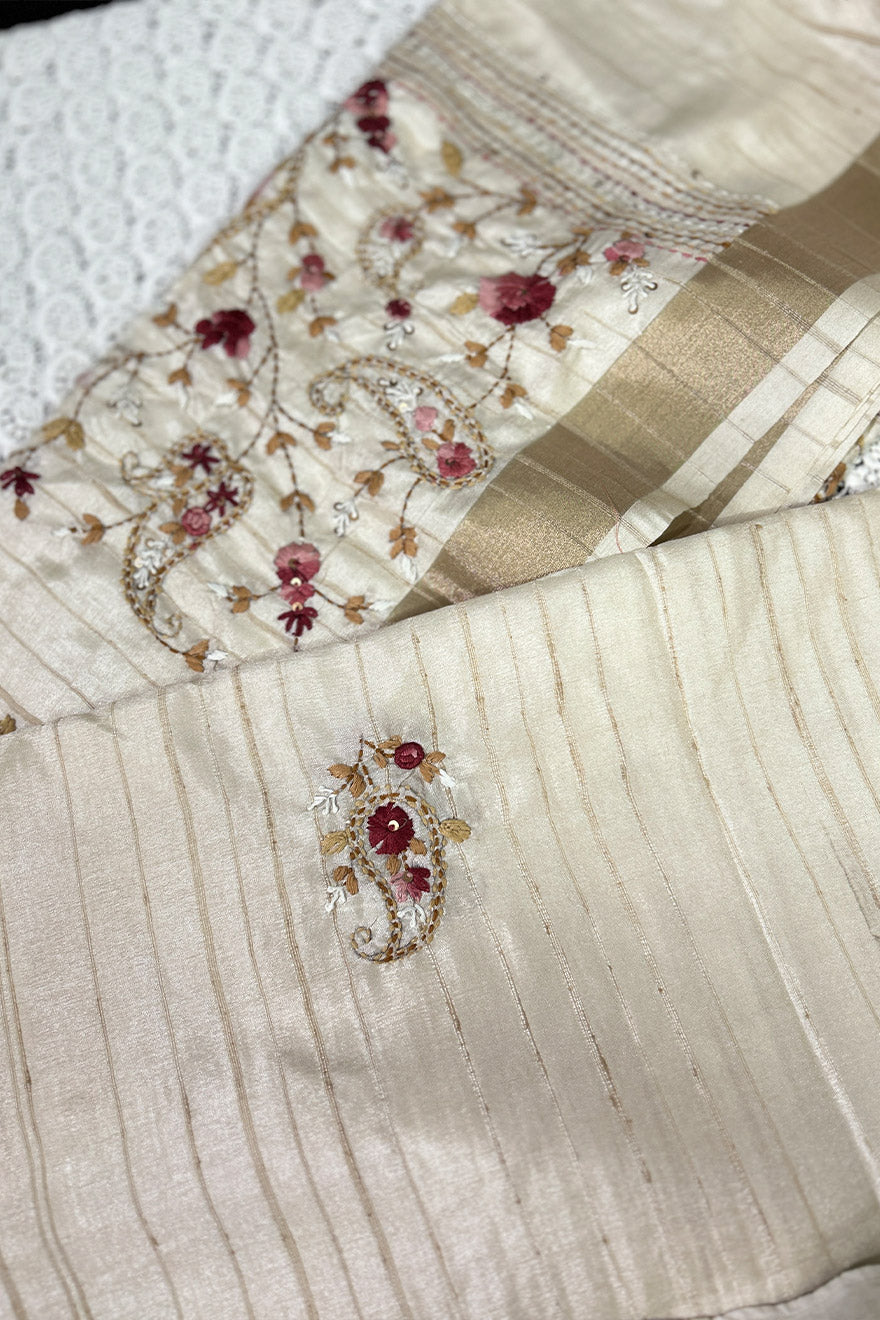 The semi Tussar Saree in beige shade comes with bullionknot  floral thread embroidery with sequence highlighting also comes with the Kantha stitches on Pallu part, butta designs all over the saree pairs with matching blouse.