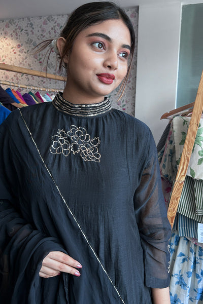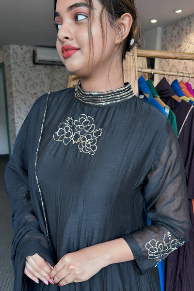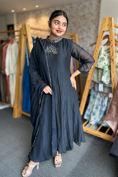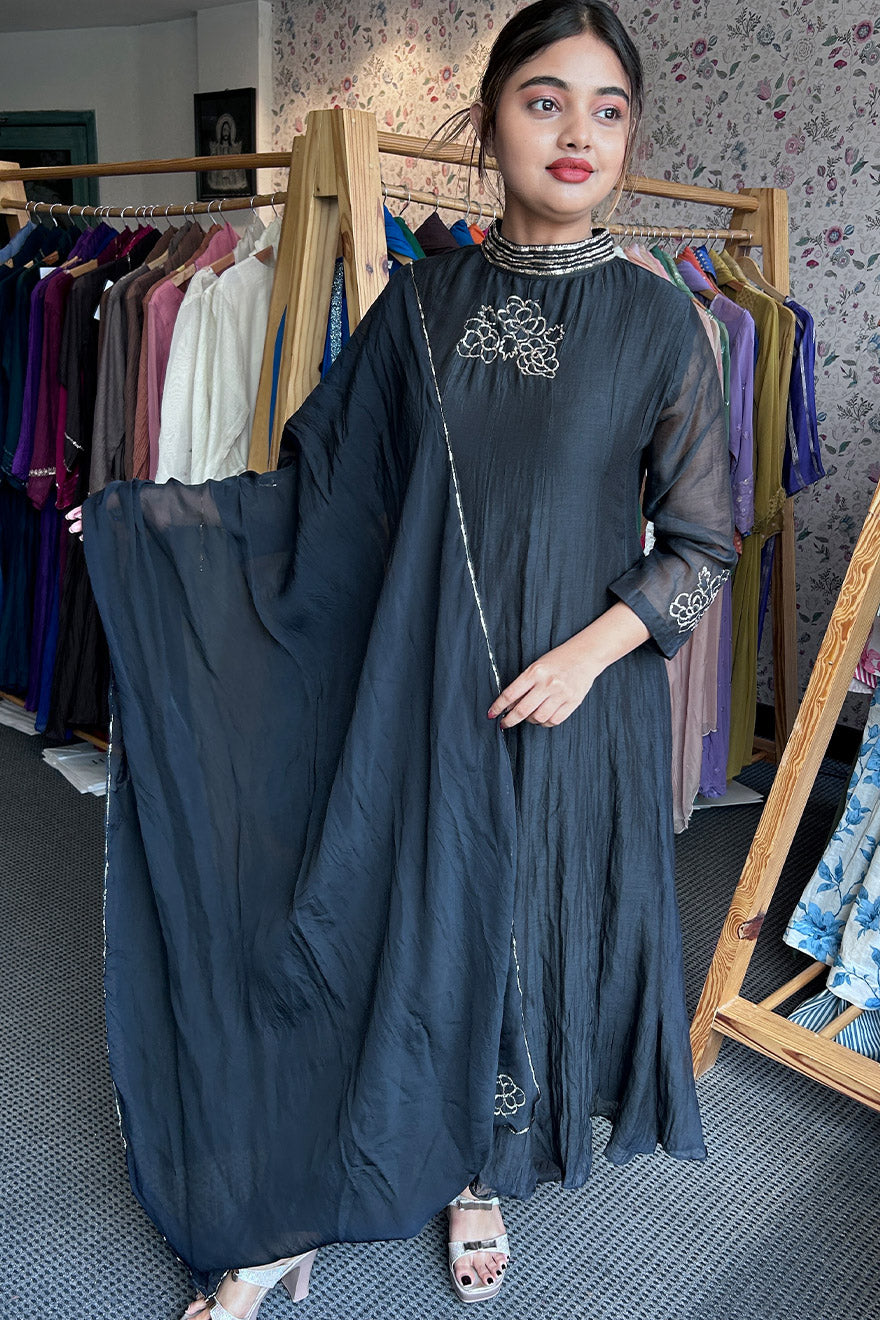 The fully stitched salwar suit comes in Malai chanderi with panel cut and pita work highlighting it. It comes with a closed neck and pairs with beautiful Dupatta and straight pant.