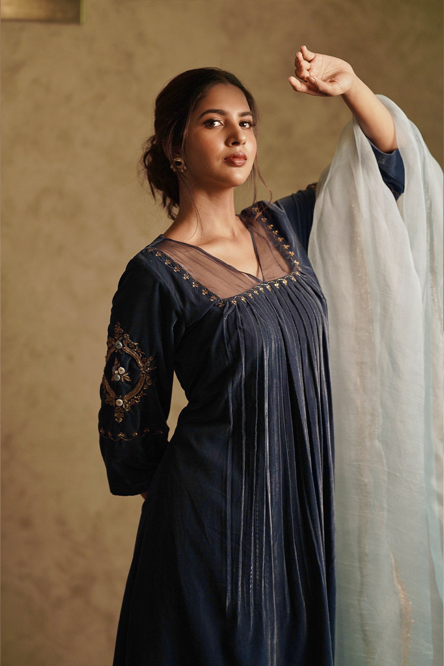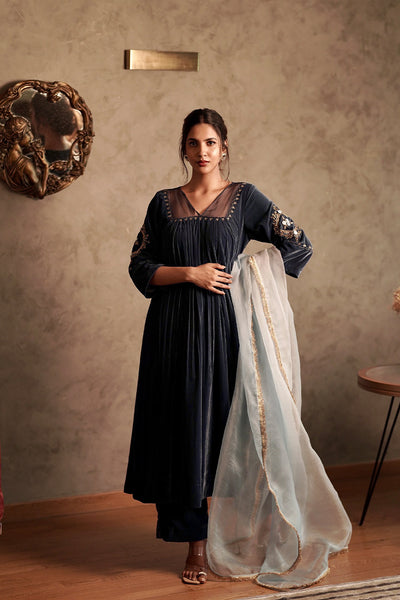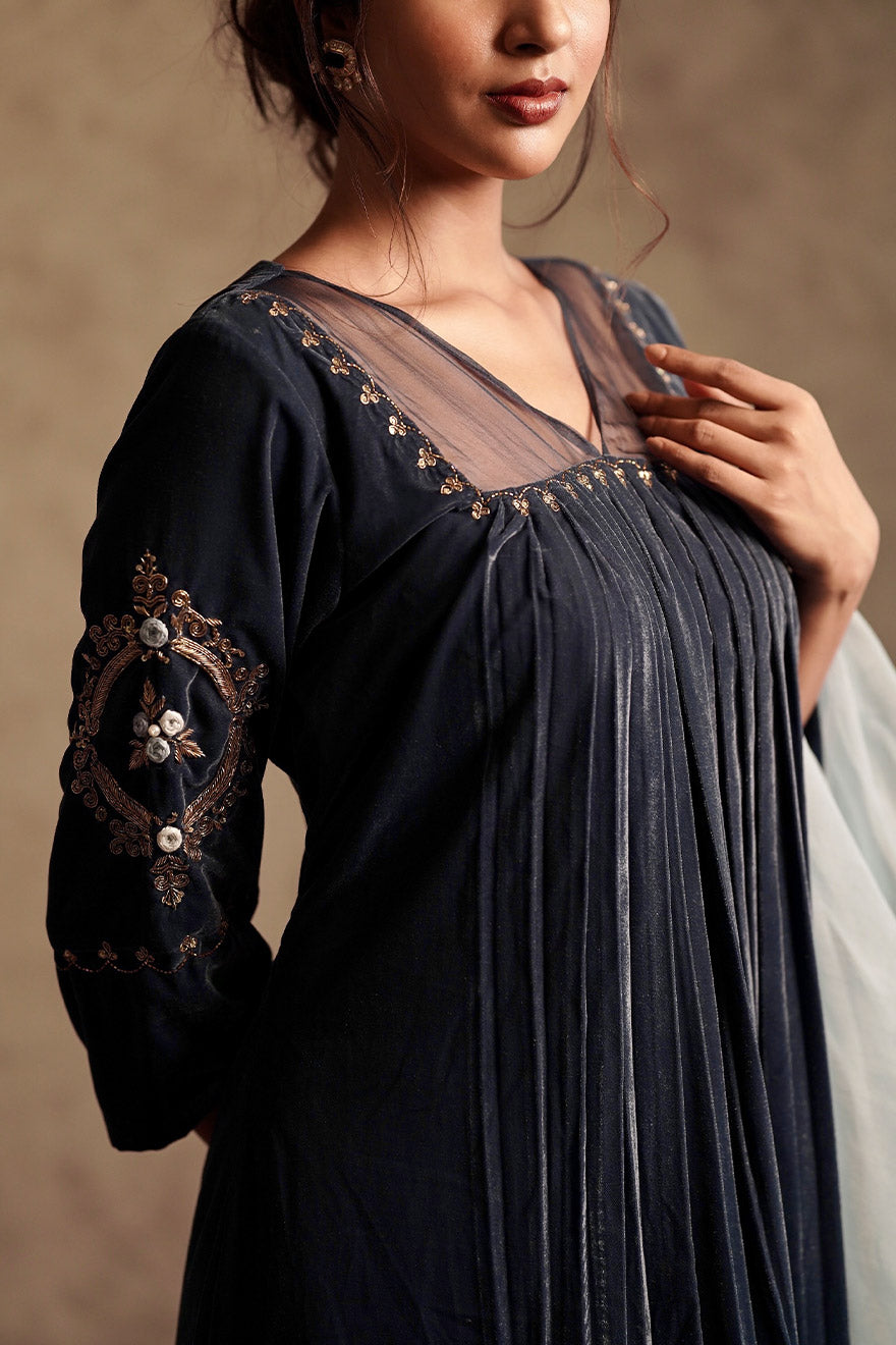Introducing Roza Royale, a majestic collection that redefines elegance. This new arrival velvet Anarkali suit exudes royalty with every stitch, crafted to perfection for the modern woman who desires both opulence and grace. The lush, rich velvet fabric drapes beautifully, offering an aura of regality that is both timeless and enchanting.