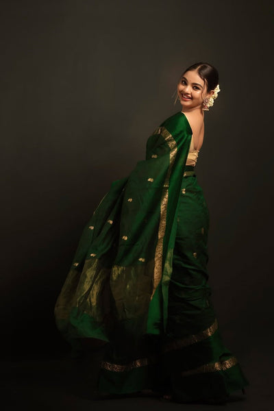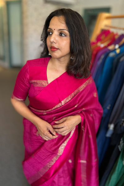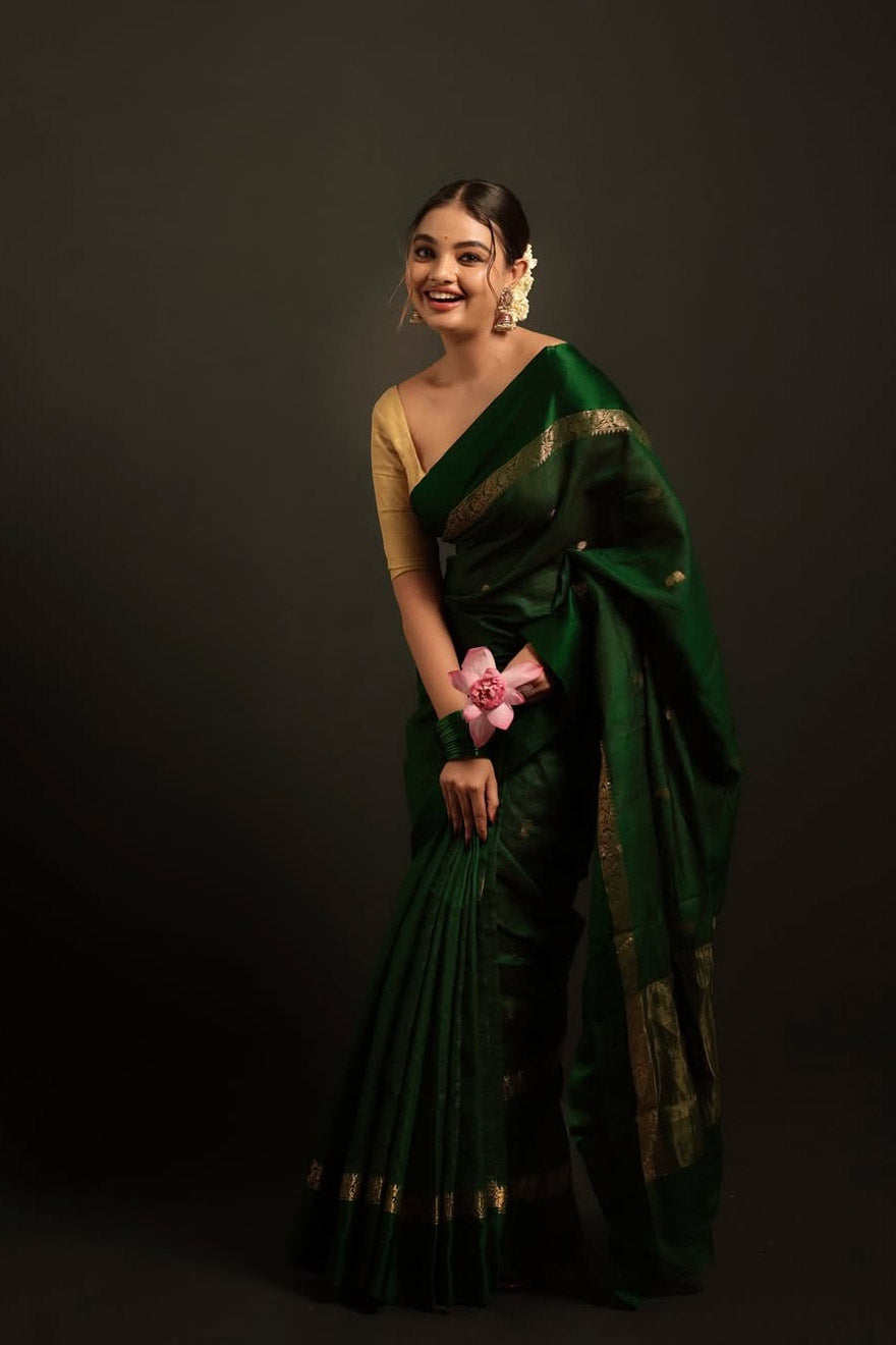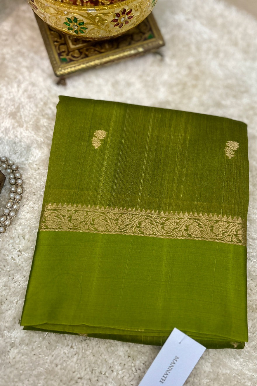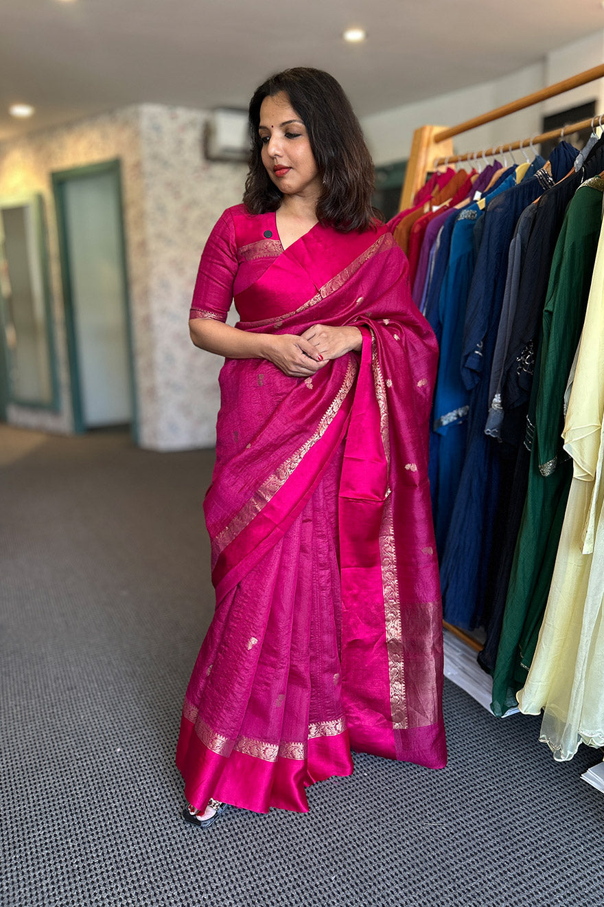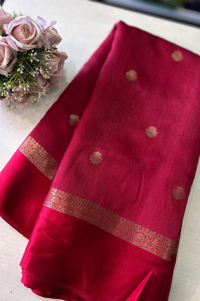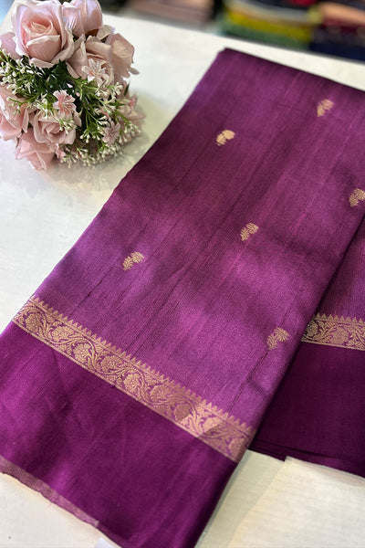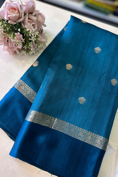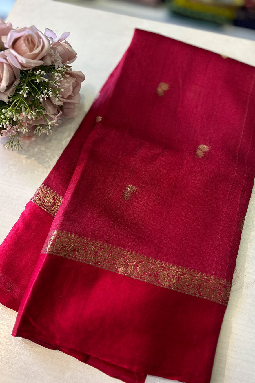 The pure raw silk saree comes with pure silk border with the Golden Zari Banarasi border, comes with the Buta weaving on Pallu area matches with same blouse material.