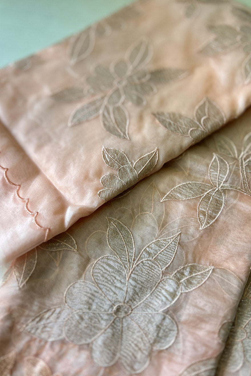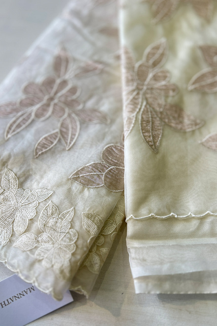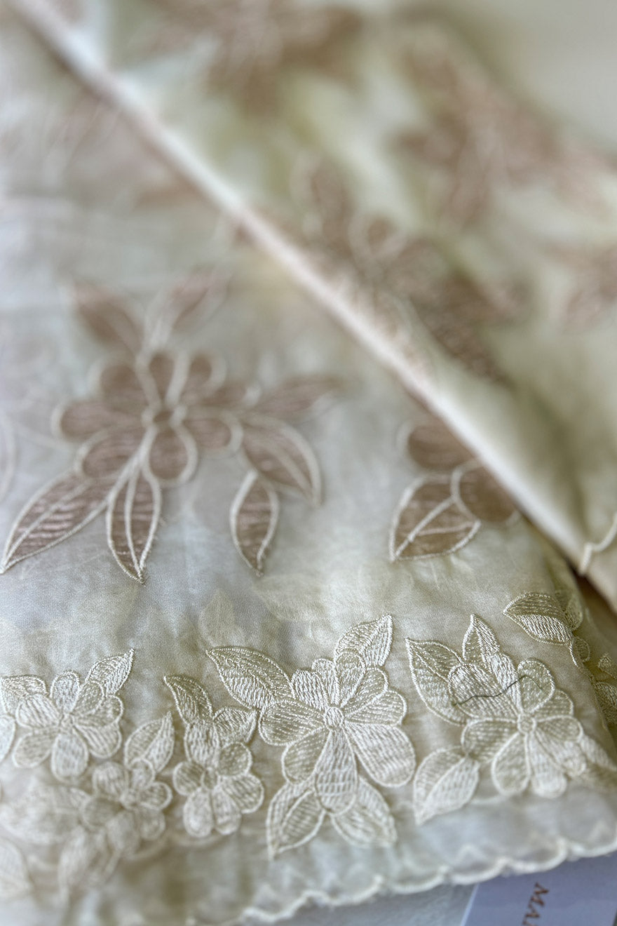 The organza saree comes with  golden floral appliqué with scallop edges and machine embroidery border on one side, it comes with chanderi blouse piece.