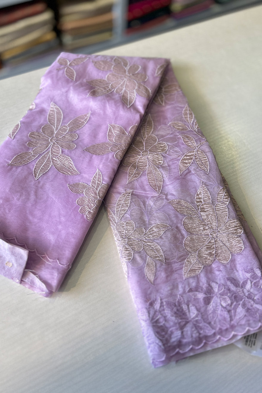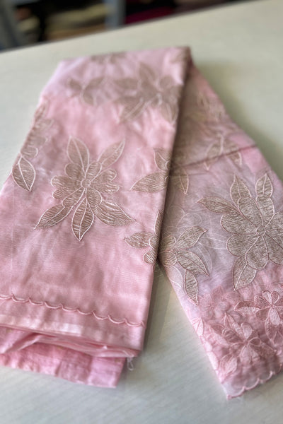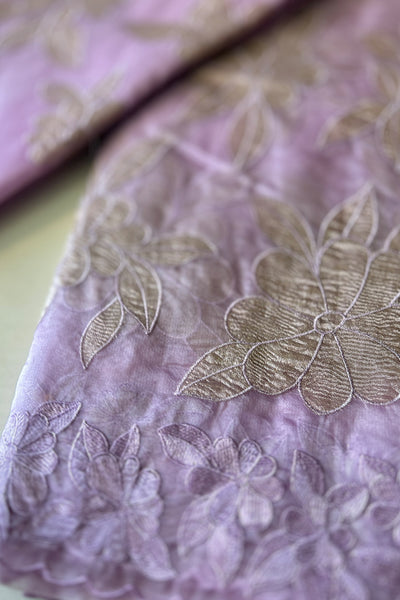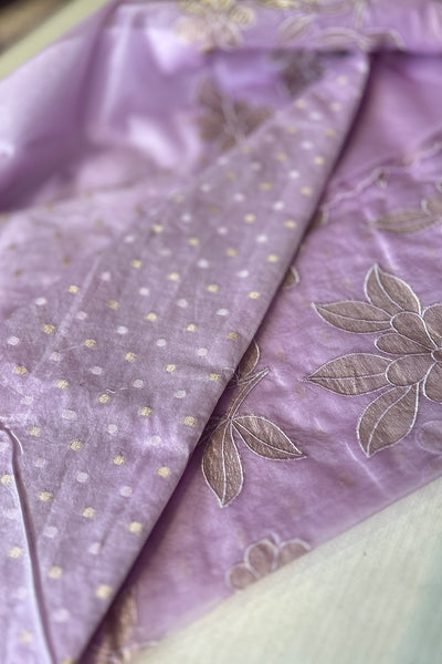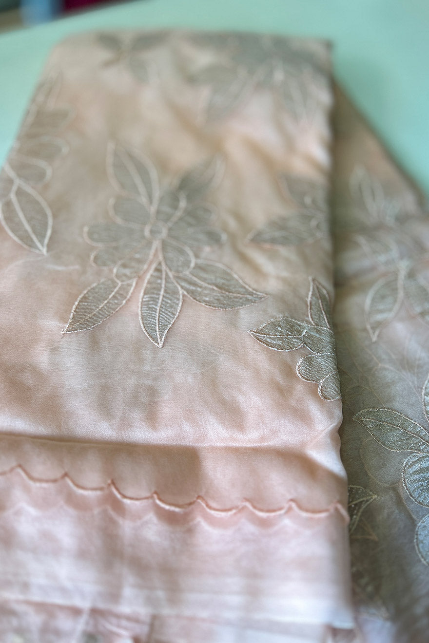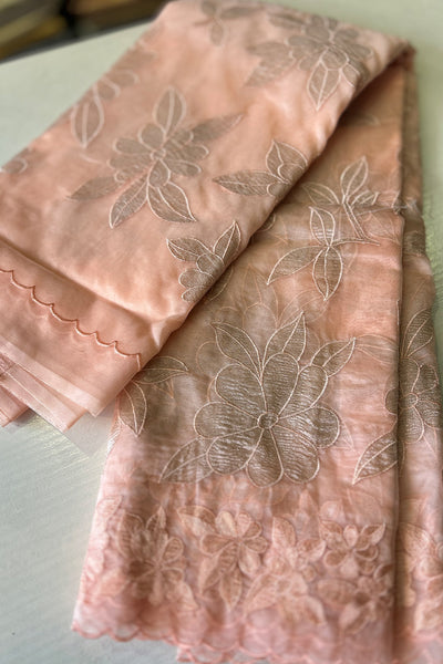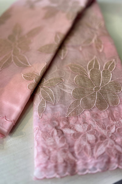 The organza saree comes with  golden floral appliqué with scallop edges and machine embroidery border on one side, it comes with chanderi blouse piece.