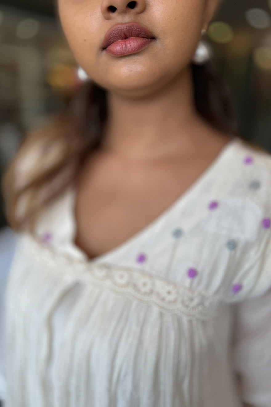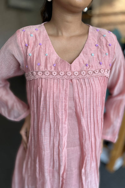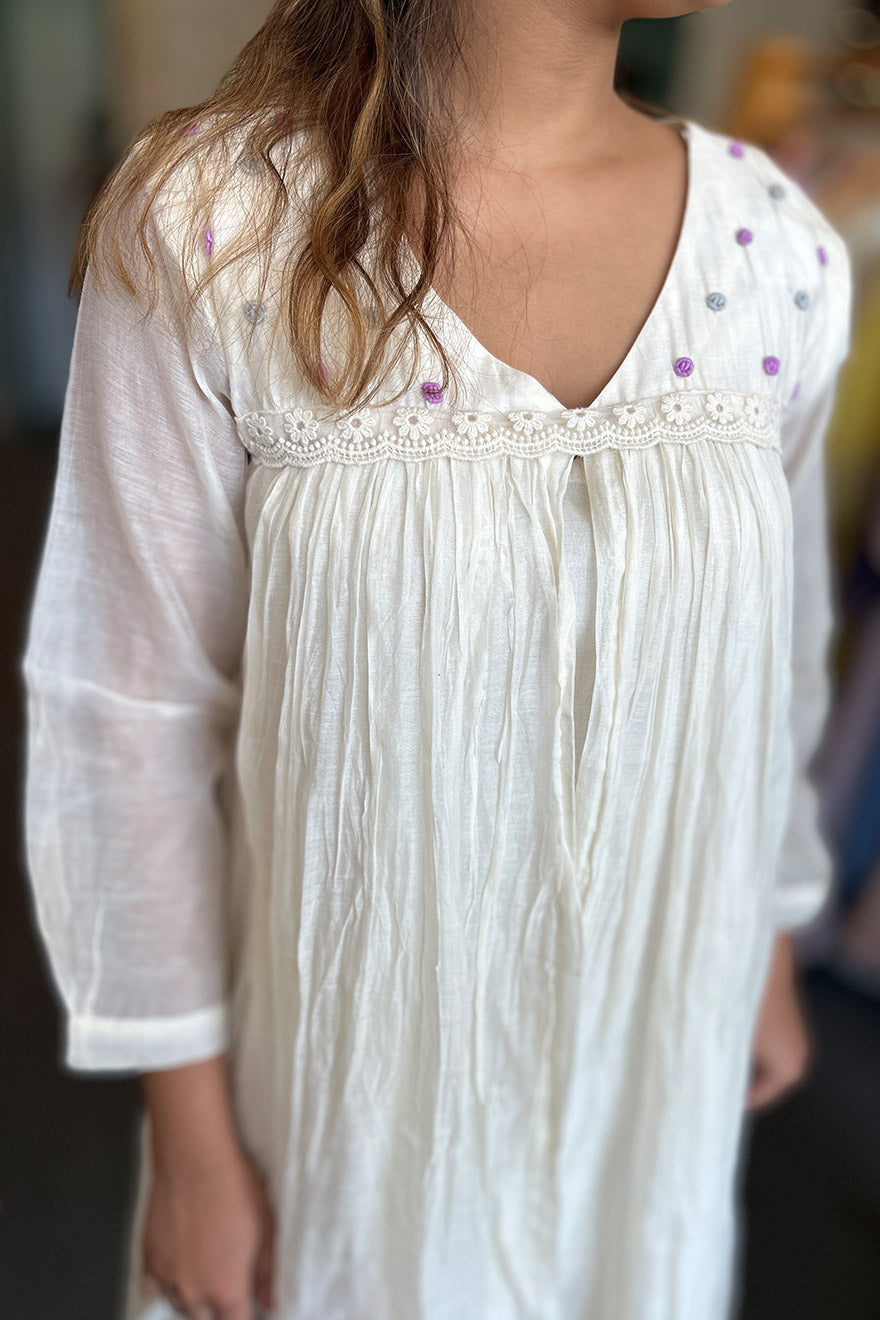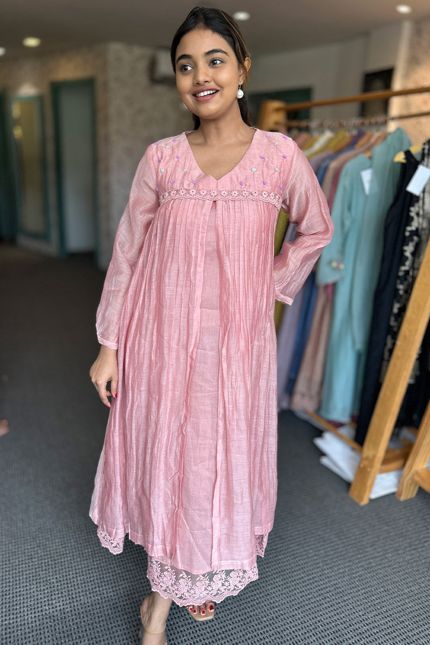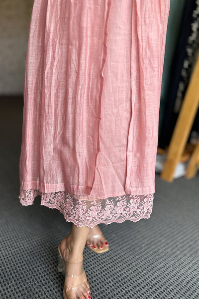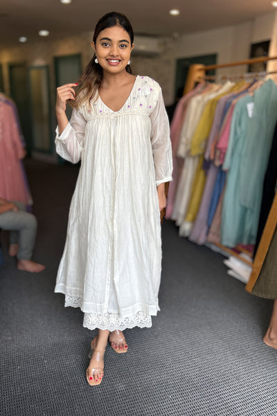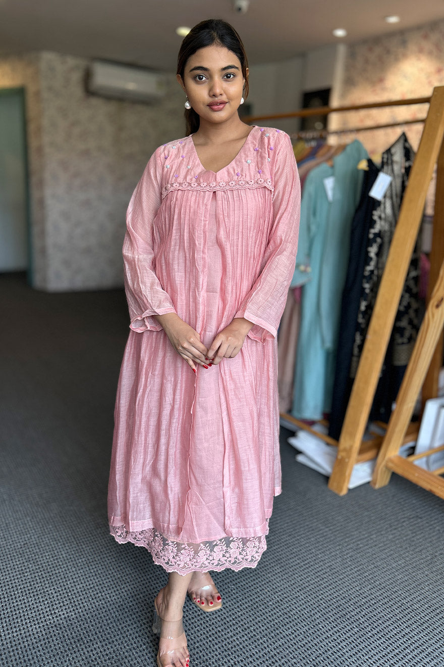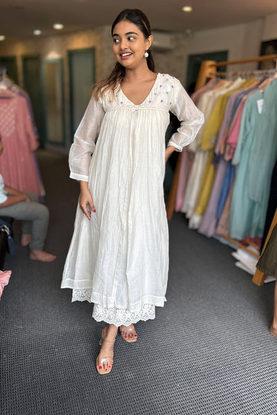 Malai Chandari Dress comes in V neck pattern with handwork on Yok and Lace - detailing on end of the inner provide with top.