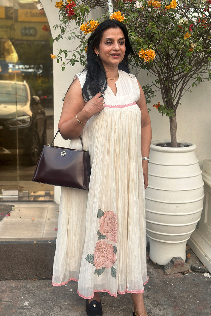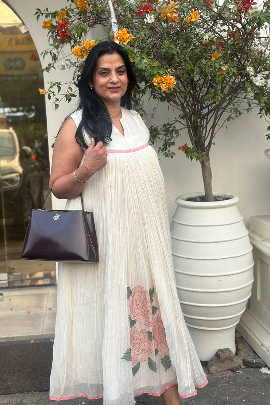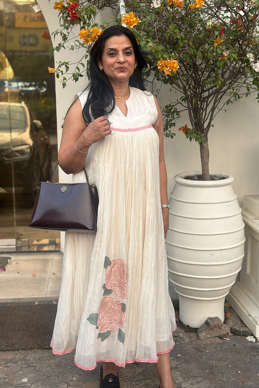 - Mul cotton gathered dress with applique placement