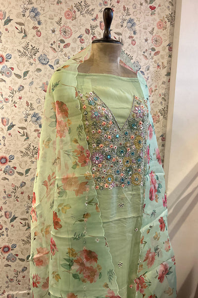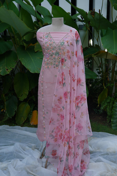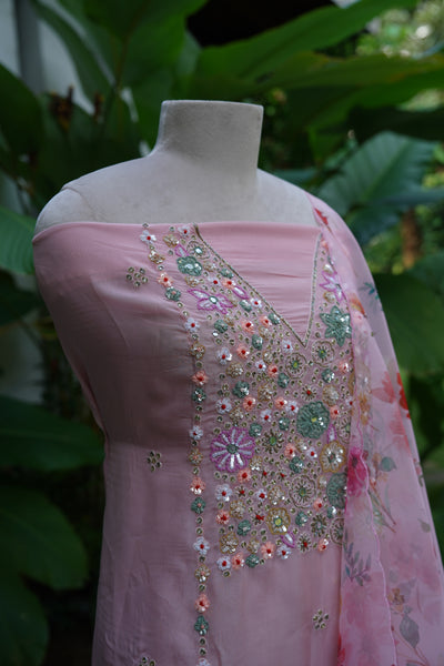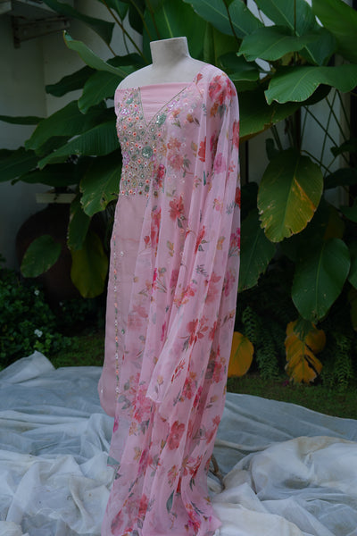 Pink Georgette organza meterial with v neck is fully hand-worked with sequence and cut beads. The dupatta is fully hand-painted