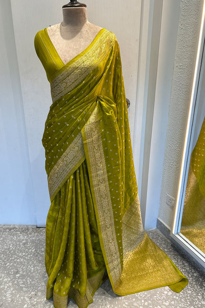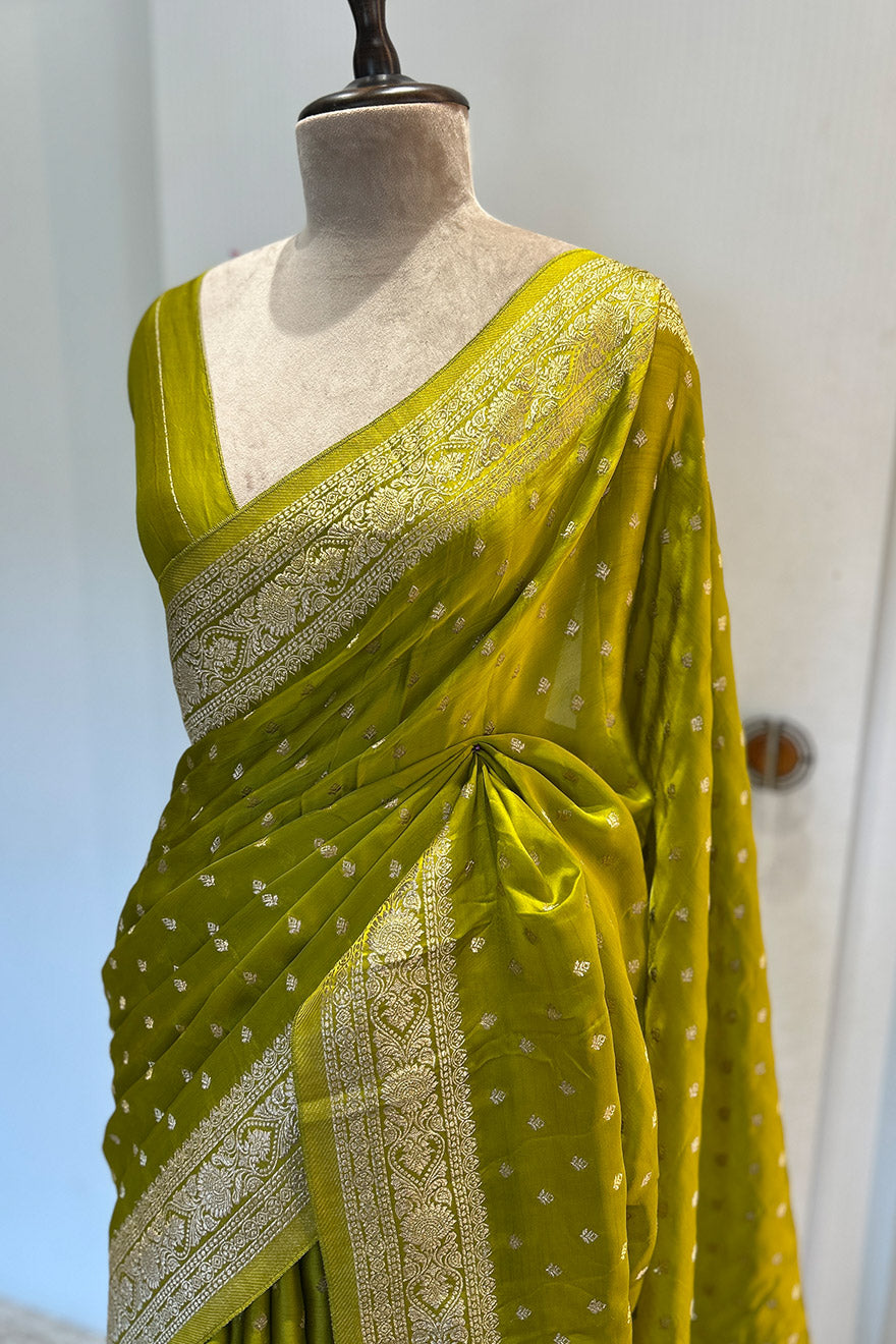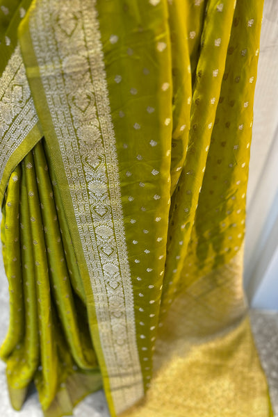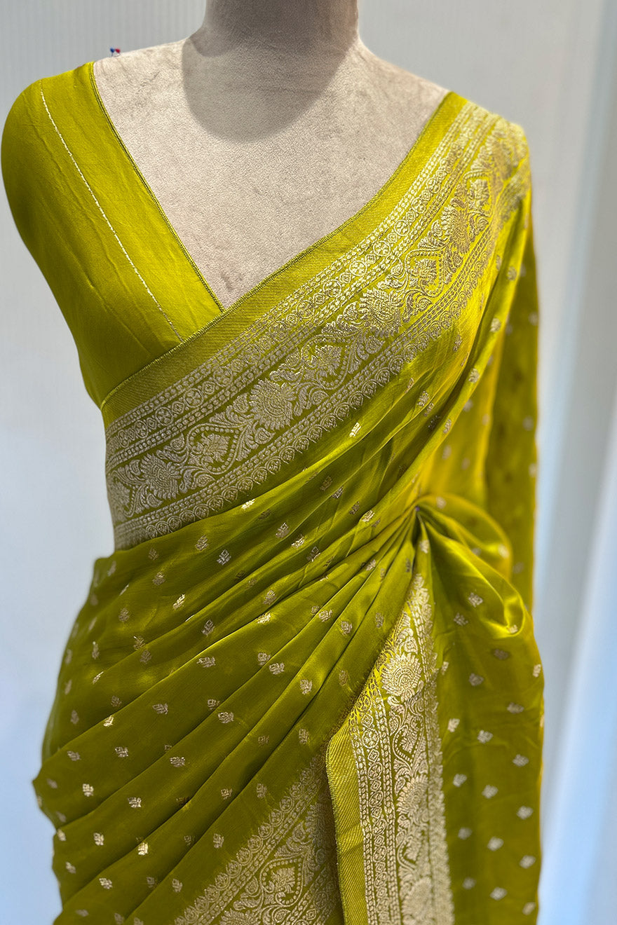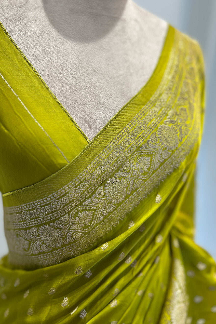 - Satin silk Banarasi lemon green saree