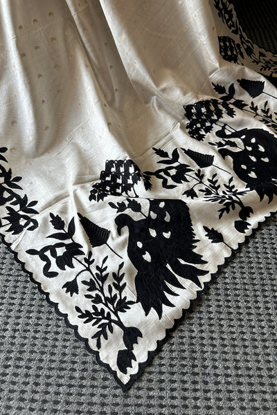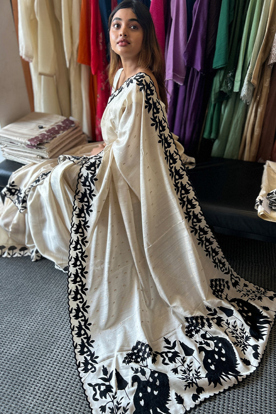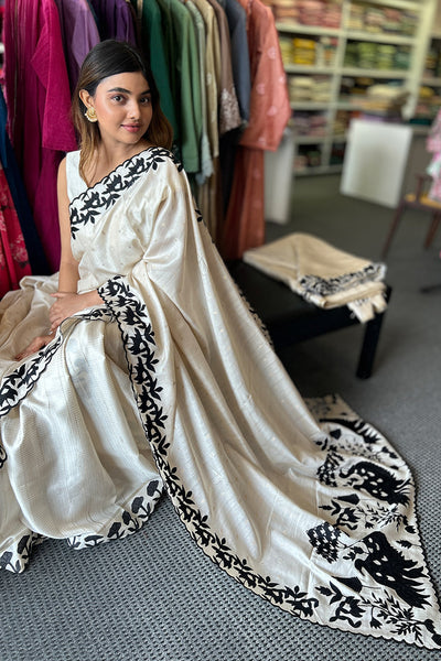 Semi Tussar saree comes with deep black appliqué borders and Pallu pair with golden stripe blouse piece.